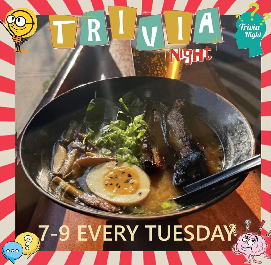 Join us for trivia night every Tuesday from 7-9. Chef special ramen dishes and $10 ramen bowls available all day!